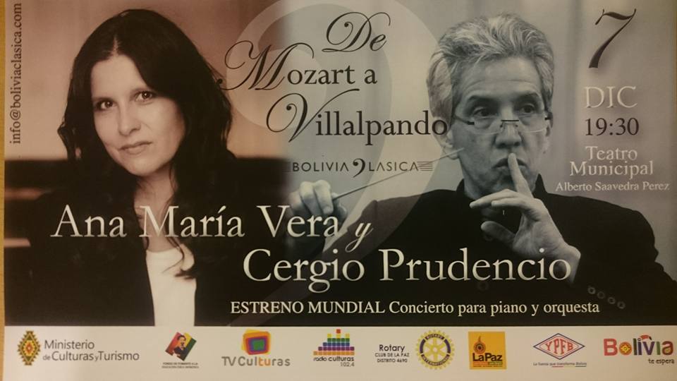 Ana-Maria Vera premieres a piano concerto by Bolivian composer Alberto Villalpando, with conductor Cergio Prudencio and the Bolivia Clasica Chamber Orchestra.